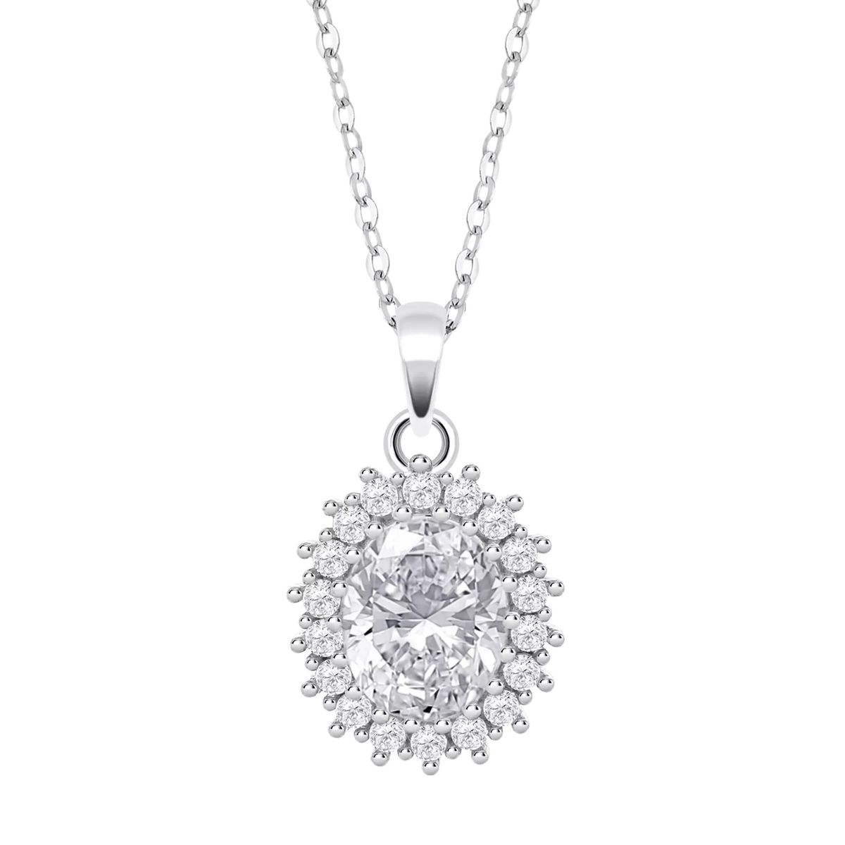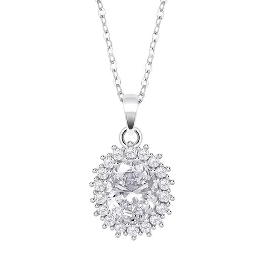 Colgante Lotus en plata de ley con acabado rodiado, con forma de rosetón y circonitas blancas engastadas. Todo un clásico que nunca pasa de moda.