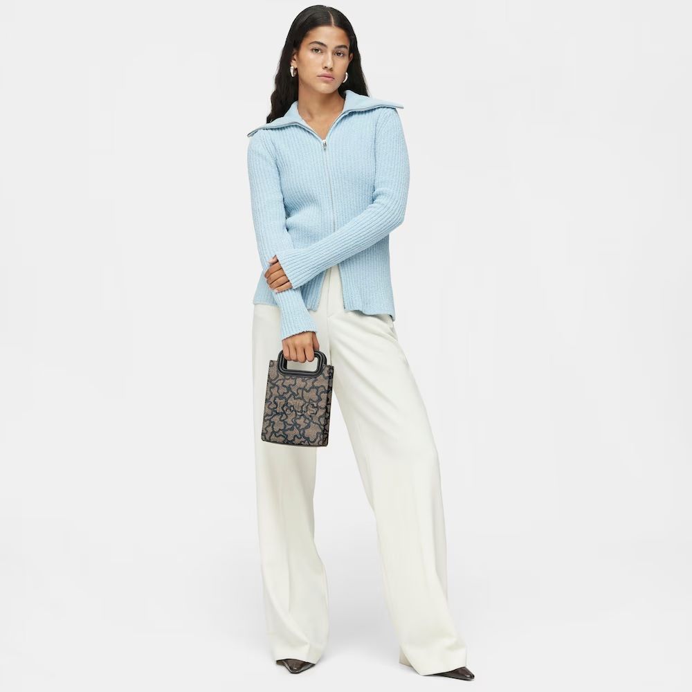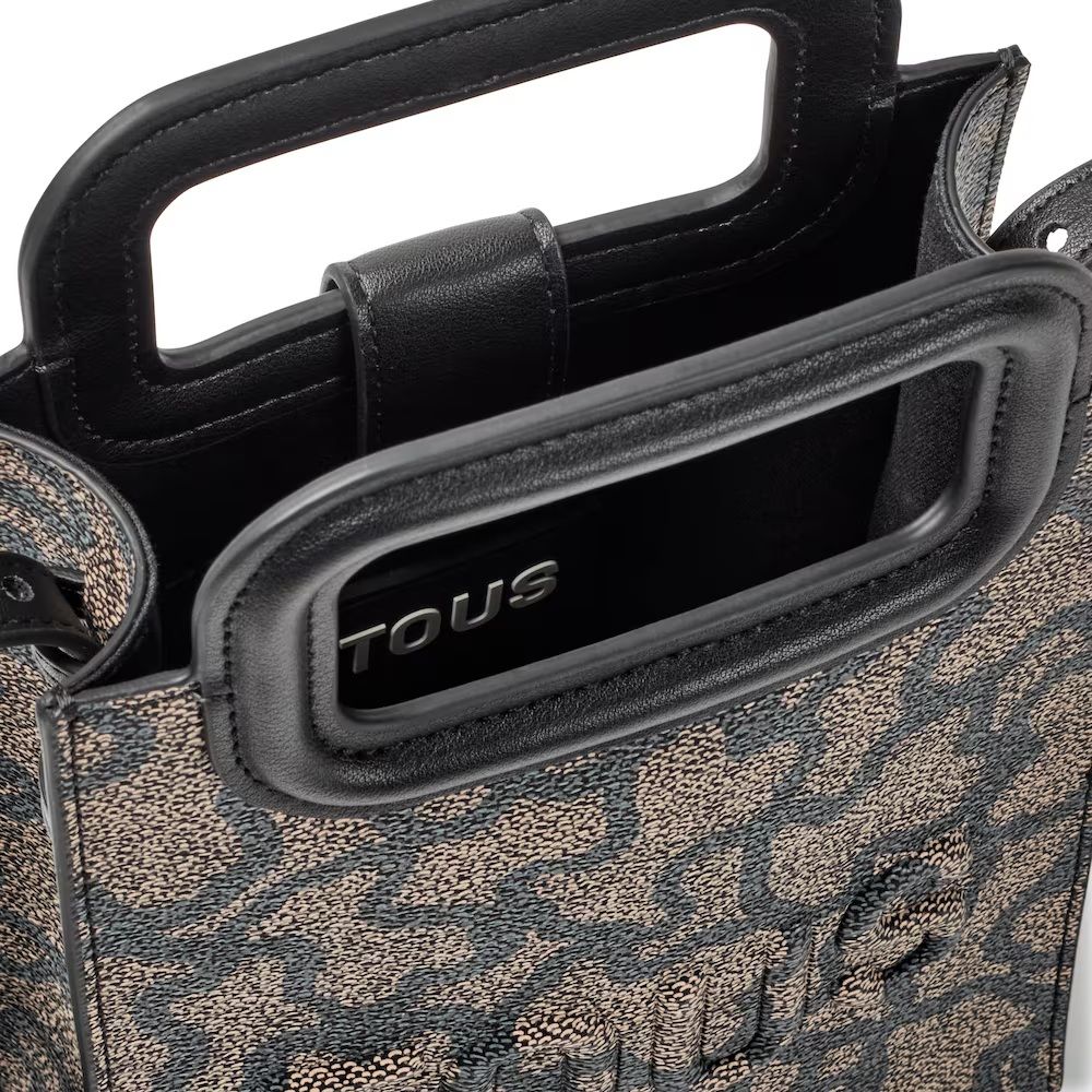 Mini Bolso Tous, de la colección Pop Kaos Ikon, fabricado en lona con estampado Kaos en color negro y gris con detalles en poliuretano. Cerrado con botón magnético, asa tipo bandolera ajustable y extraíble, también cuenta con asas de mano fijas. Una cucada para llevar lo imprescindible.