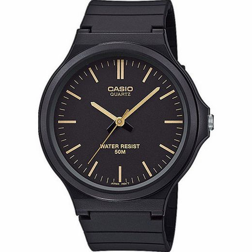 Reloj Casio con caja y brazalete de resina negra. Con esfera negra, agujas e insignias en dorado.