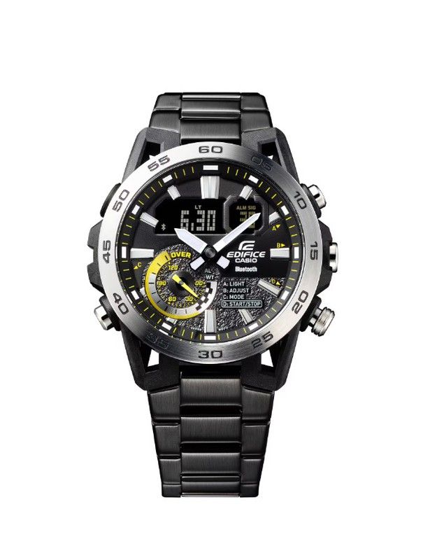 Reloj Casio de la colección Edifice fabricado en acero inoxidable acabado en Ip negro, digital-analógico inspirado en la suspensión de los coches de fórmula 1, con lengüetas dispuestas en cuatro brazos, dos por encima y dos por debajo. La resina reforzada con fibra de carbono proporciona una caja ligera pero resistente. un reloj de alto rendimiento con función de enlace con smarphone a través de Bluetooth®, se conecta a la aplicación de CasioWatches para tener todas las funciones al alcance de la mano. Como particularidad el temporizador programable se sincroniza con la aplicación de calendario del smartphone para transmitir al teléfono la información del programa y mostrar las horas de inicio y fin en la pantalla LCD del reloj. Con una sencilla inclinación de la muñeca dispone de luz led de alta luminosidad. Todo un espectáculo de reloj.