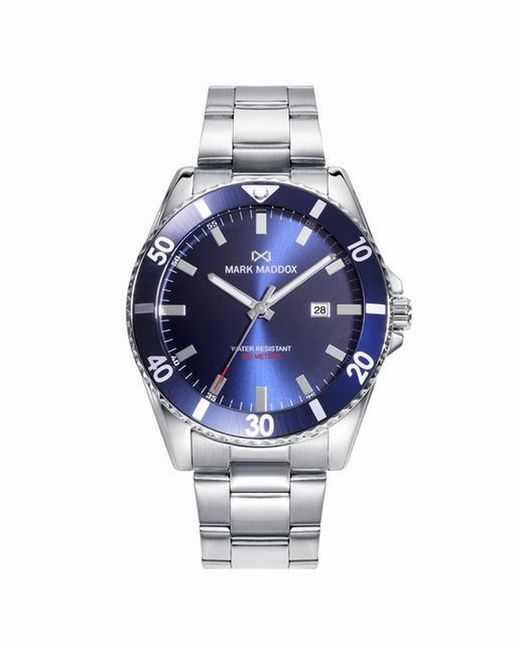 Reloj de hombre Mark Maddox de la colección Mission, fabricado en acero inoxidable. El bisel es de aluminio azul, cuenta con índices y agujas en color blanco para destacar. Un reloj para todas las ocasiones y outfits.
