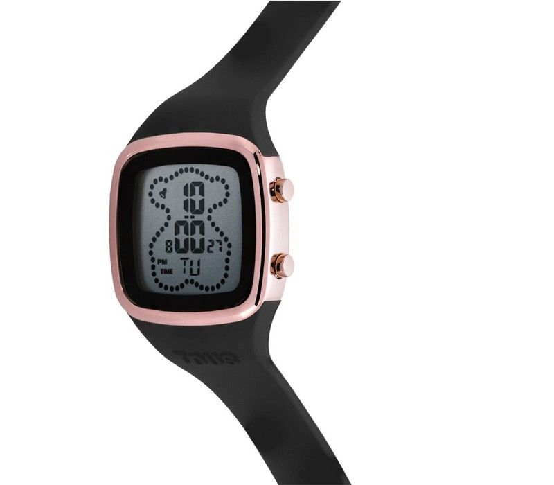 Reloj digital Tous de la colección B-Time, fabricado en acero inoxidable IPG rosado con correa de silicona negra. Pantalla de cristal líquido (LCD). Varias funciones tales como cronógrafo, 5 alarmas….
