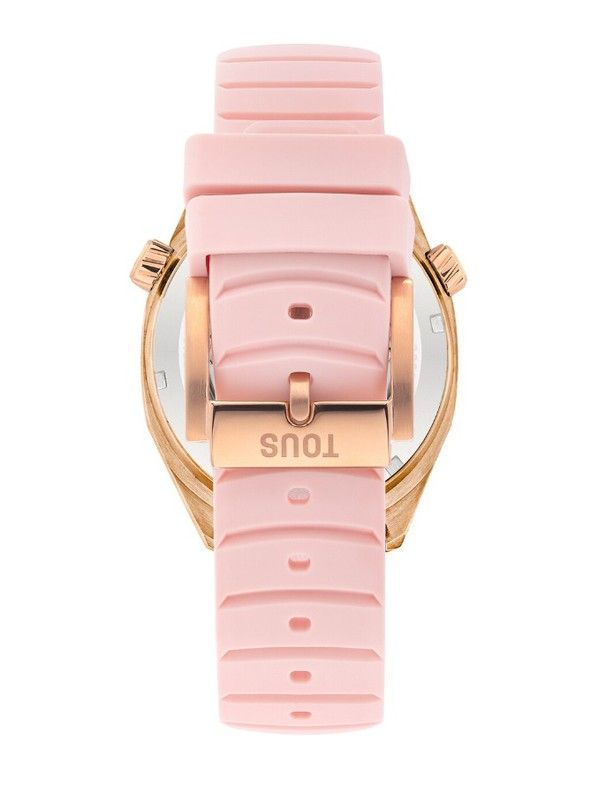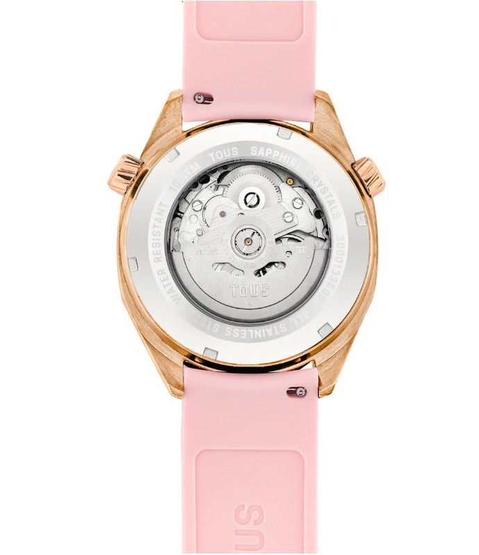 Reloj Tous con movimiento automático y cristal zafiro. Fabricado en acero inoxidable Ip rosado, con correa de silicona, esfera nacarada rosa y Bisel interior giratorio calibrado en 24 horas accionado con la corona izquierda. Es una colección diseñada para inspirarte a disfrutar del tiempo a tu manera, a seguir tu propio ritmo, a permitirte llegar tarde si es lo que deseas. Disfruta de tu tiempo.