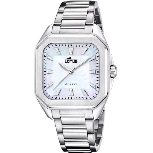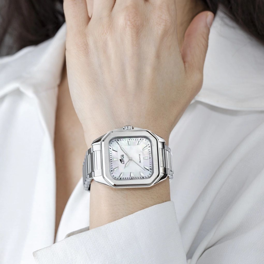 Reloj Lotus de la colección Square. Fabricado en acero inoxidable. Esfera nacarada con insignias y agujas luminiscentes, dando un toque de estilo clásico y discreto, símbolo de lujo cuidado, elegante y discreto.