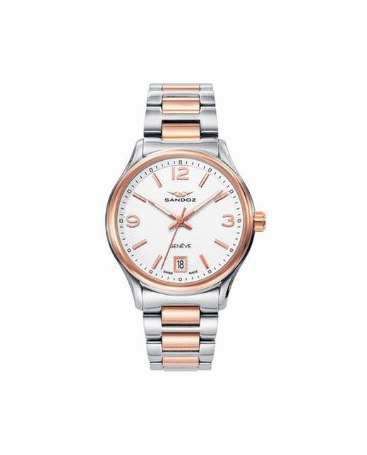 Reloj de mujer Sandoz en acero inoxidable combinado Ip rosa, con cristal de zafiro, esfera blanca con insignias y agujas en rosado, calendario a las seis. Modelo atemporal renovado.