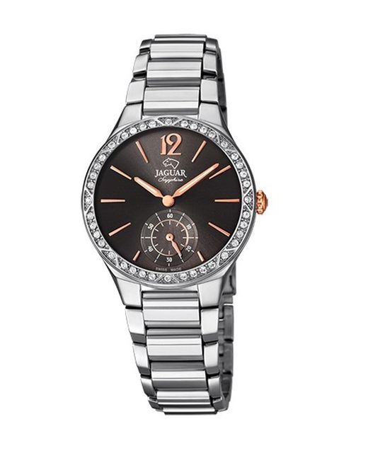 Reloj suizo Jaguar para mujer. Con caja de acero inoxidable 316l + circonitas de 31.0 mm de diámetro, con cristal zafiro y armys de acero inoxidable 316l, esfera de color negro. Elegante para cualquier tipo de ocasión.