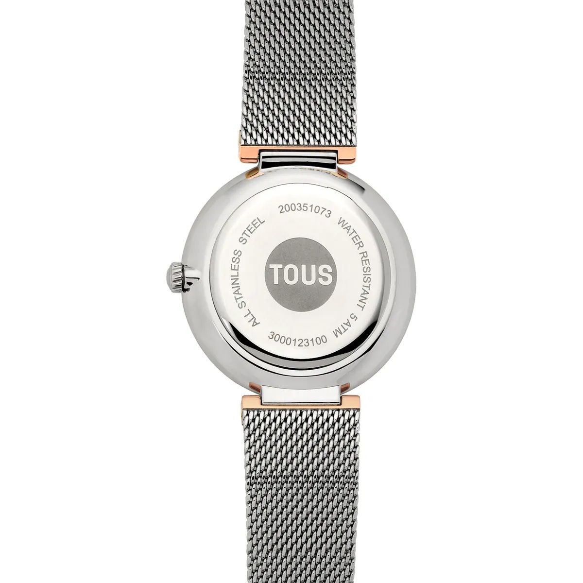 Reloj Tous fabricado en acero inoxidable combinado con detalles en Ip rosado. Esfera efecto espejo, será tu pequeño aliado para poder verte. Brazalete de esterilla con cierre deslizante.