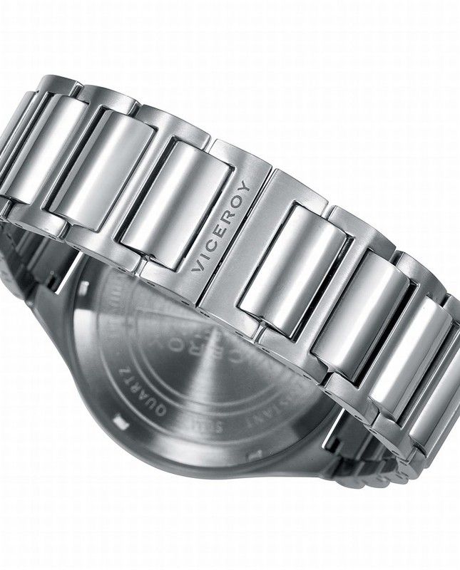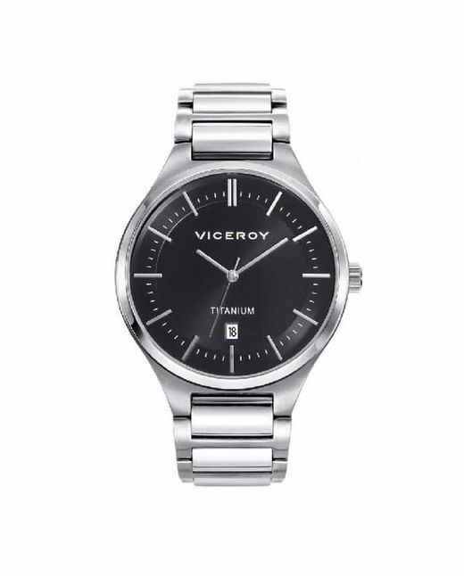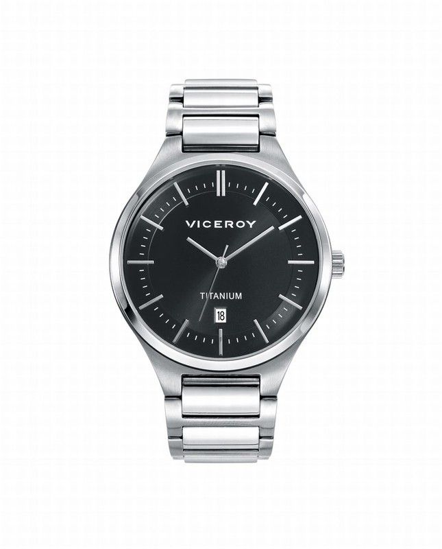 Reloj de Hombre Viceroy Grand tres agujas con la caja y el brazalete de titanio, esfera negra con los índices en plateado y el calendario a las 6. Impermeable 50 metros. Diámetro de la caja de 43 mm. Ligero y elegante para todo tipo de ocasiones.